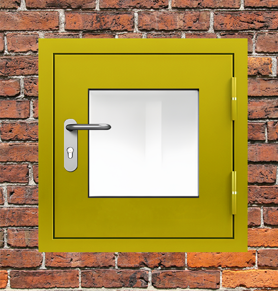 Специализированное решение люк металлический желтый с окном и блестящей ручкой для комплексного обеспечения требований пожарной безопасности.