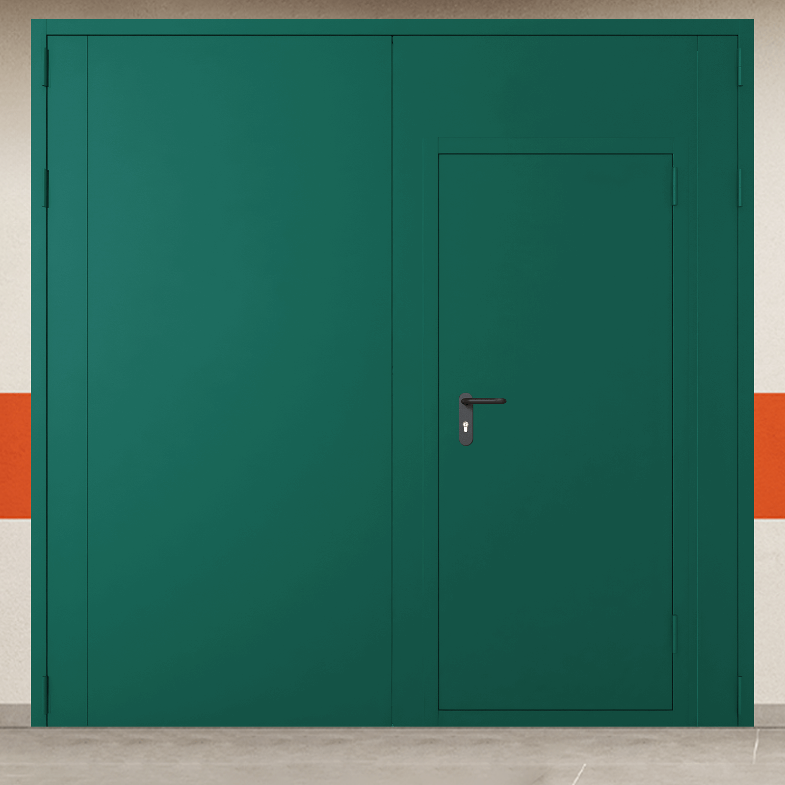 Специализированное решение ворота металлические двустворчатые зеленые с блестящей ручкой без доводчика для комплексного обеспечения требований пожарной безопасности.
